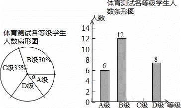 為了解中考體育科目訓練情況,改進訓練方法,減輕學生負擔,某縣教育局從全縣九年級學生中隨機抽取了部分學生進行了一次中考體育科目測試(把測試結果分為四個等級:A級:優秀;B級:良好;C級:及格;D級:不及格),并將測試結果繪成了如下兩幅不完整的統計圖.