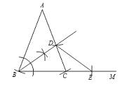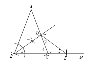 【解析】試題分析:(1)①以點A為圓心,AB的長為半徑畫圓弧交射線BM與點C,連接AC;②以點B位圓心畫一段圓弧分別交AB、BC于兩點,然后分別以這兩個點位圓心,畫兩段半徑相等的圓弧并交于一點,連接此點與B點并延長交AC于點D;③以點C位圓心,CD的長為半徑畫圓弧交射線CM于點E,連接DE;(2)猜想BD=DE,要證明DE=BD,即要證明∠1=∠3,有題目已知條件不難得出∠1=