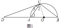 【題目】如圖1,AB為半圓O的直徑,D為BA的延長線上一點,DC為半圓O的切線,切點為C.![]()