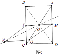 ③如圖6中,當(dāng)點(diǎn)P在BC上,PM經(jīng)過點(diǎn)O時(shí),直線ON將PMQN的面積分成1:3的兩部分,易知t=