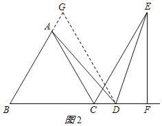 (2)如圖1,若點D在線段BC上,證明:①AD=DE;②BC=DC+2CF(提示:構(gòu)造全等三角形);
