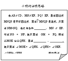 (2) 小明在完成(1)的證明后繼續(xù)進(jìn)行了探索.過G作MN ∥ EF,分別交AB、CD于點(diǎn)M、N,過H作PQ ∥ EF,分別交AB、CD于點(diǎn)P、Q,得到四邊形MNQP.此時(shí),他猜想四邊形MNQP是菱形,請?jiān)谙铝锌驁D中補(bǔ)全他的證明思路.