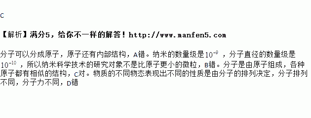 B. 納米科學技術的研究對象是比原子更小的微粒