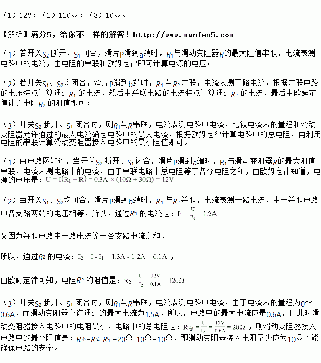 (1)若開關S2斷開、S1閉合,滑片P滑到a端時,電流表的示數為0.3A,則電源電壓為多大?