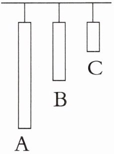 將A、B、C三根粗細相同、長短不同的鐵棒并排掛著,并用一根鐵棒依次敲擊,請用“1”“2”“3”三個音階判斷出三根鐵棒聲音的高低。