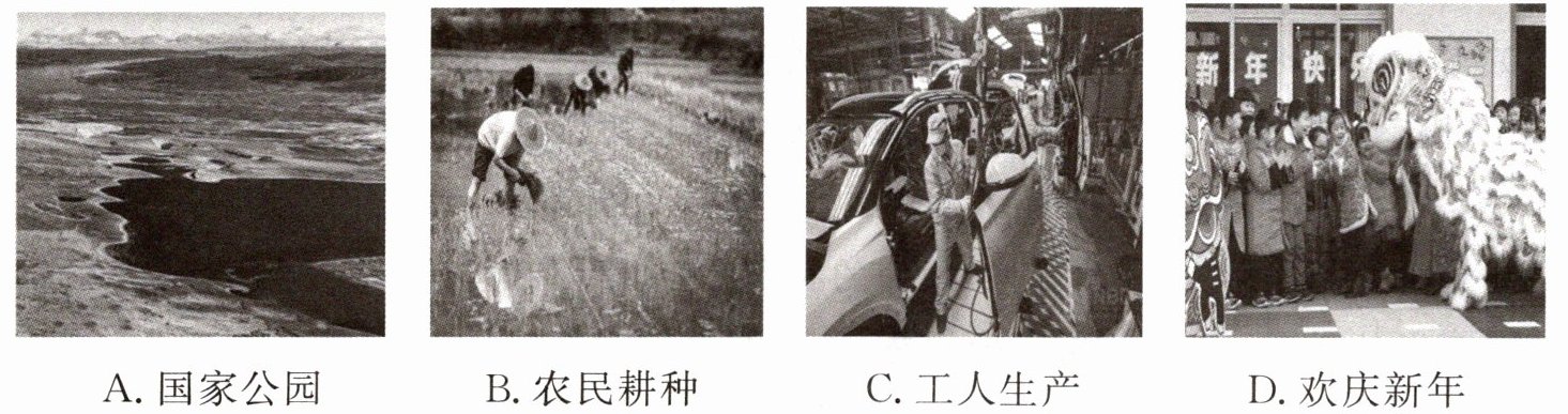 題目要求選擇不能體現社會絢麗多彩的選項。A體現自然景觀,雖屬于社會生活的一部分,但更偏向自然屬性,相較于其他選項直接反映人類社會活動的多樣性,其社會屬性較弱;B體現農業生產活動,是社會生活的重要方面;C體現工業生產活動,反映社會經濟的多樣面貌;D體現文化慶祝活動,屬于社會文化生活內容。因此A相對其他選項,不能直接體現社會生活的絢麗多彩。