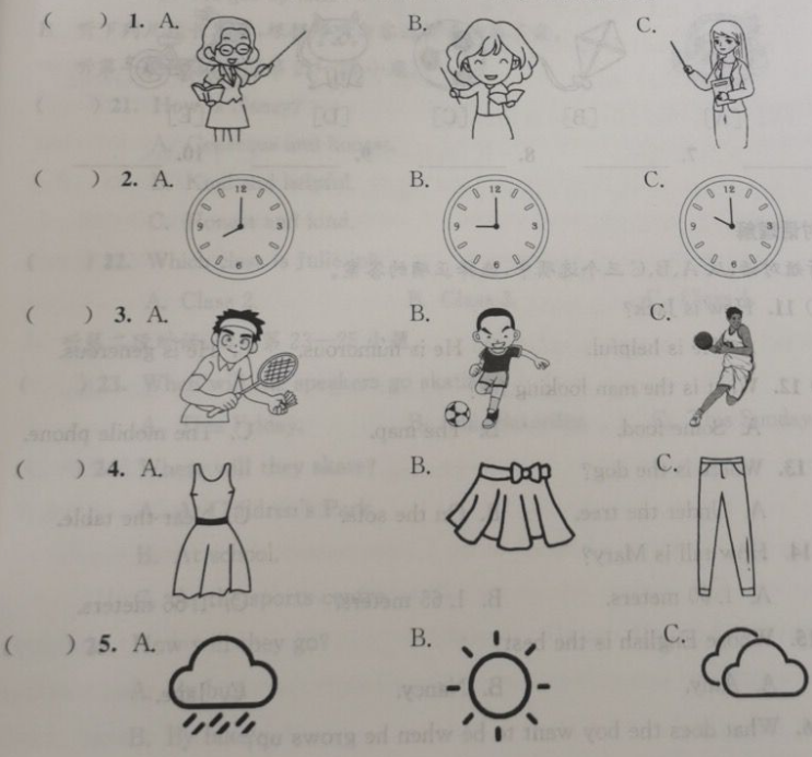A聽句子,從A,B.C三個選項中,找出與所聽內容相符的圖片。