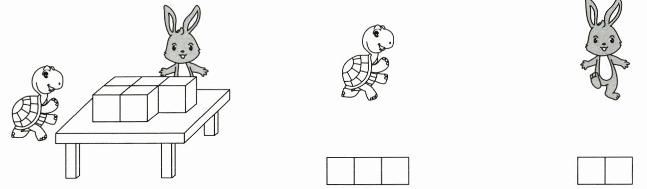 從正面(烏龜視角)看到3個并排的正方形;從上面(兔子視角)看到2個并排的正方形。連線時烏龜連3個正方形的圖形,兔子連2個正方形的圖形。