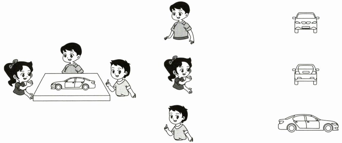 從不同方向觀察汽車:正面看到車頭,后面看到車尾,側面看到車身側面。左邊女孩在汽車側面,看到車身側面;中間男孩在汽車后面,看到車尾;右邊男孩在汽車正面,看到車頭。