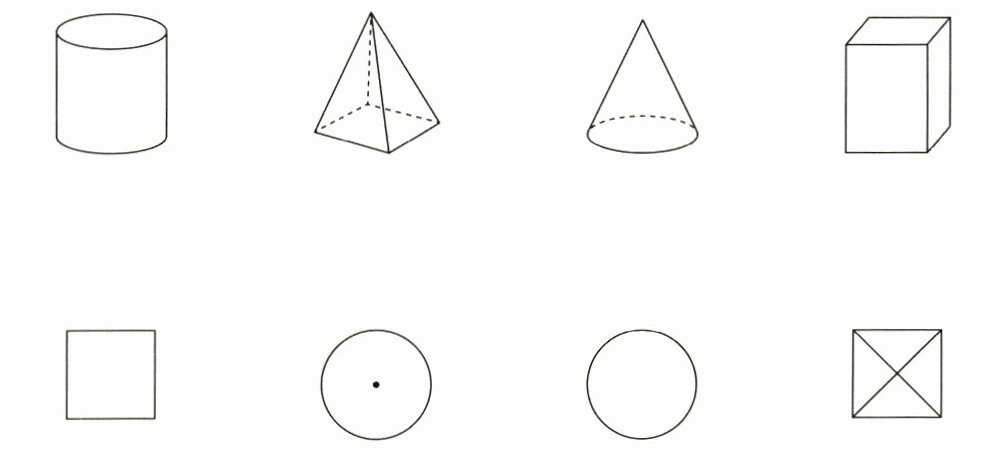 圓柱從上面看是圓;四棱錐從上面看是帶中心點的正方形(即正方形內有兩條對角線相交于一點);圓錐從上面看是帶中心點的圓;正方體從上面看是正方形。據此連線。