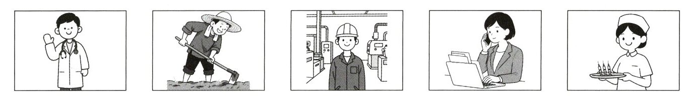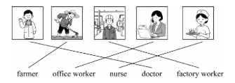 1. 圖1醫生(doctor)連doctor;2. 圖2農民(farmer)連farmer;3. 圖3工廠工人(factory worker)連factory worker;4. 圖4辦公室職員(office worker)連office worker;5. 圖5護士(nurse)連nurse。標號順序為圖1-5對應1-5。
