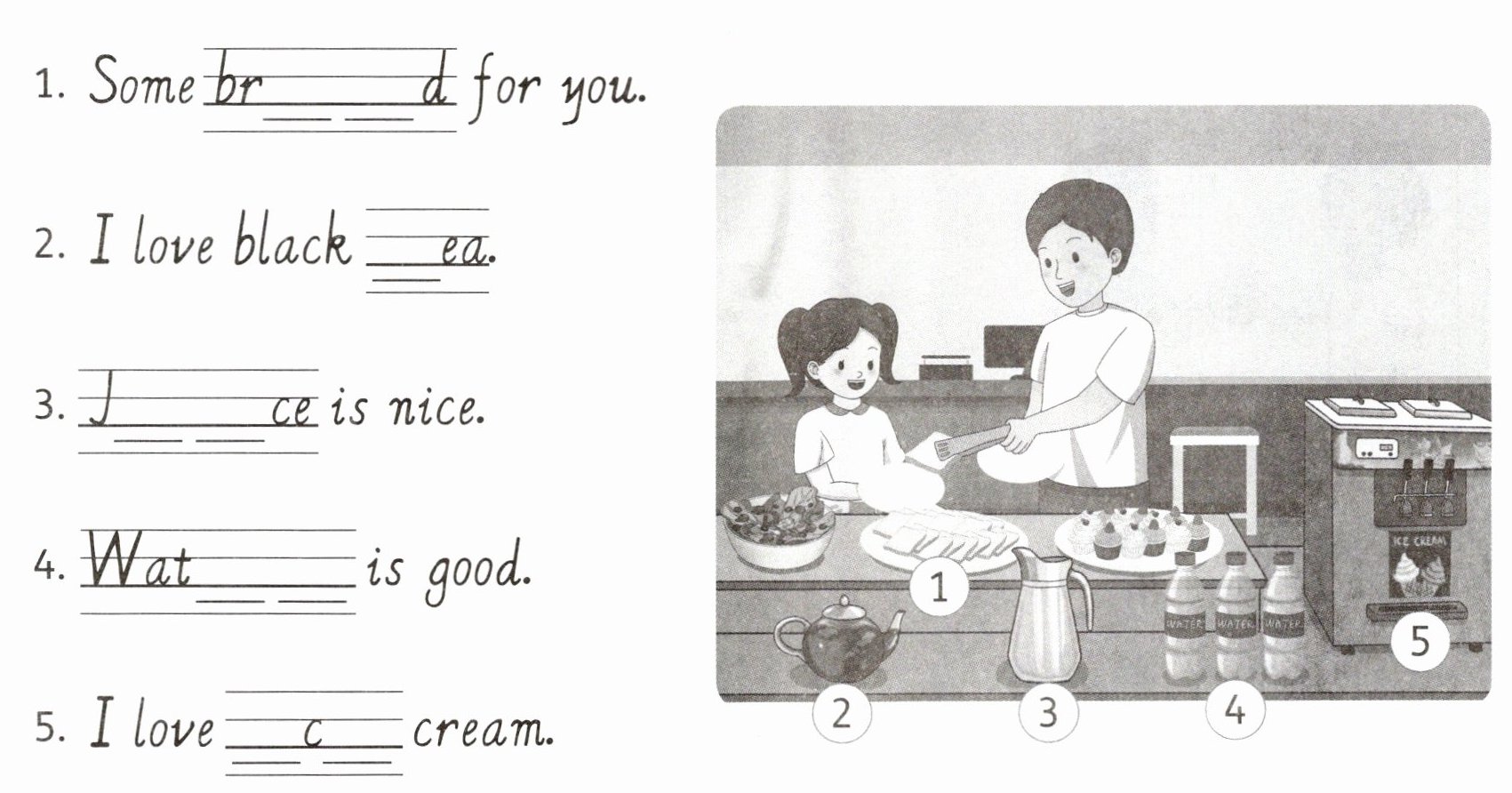 1. 圖1顯示為面包,“面包”英文是bread,故填ea。
