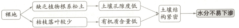 (2)裸地缺乏植物根系松土,土壤孔隙度低,水分下滲能力弱;(2分)裸地有機質含量低,土壤結構緊密,水分不易下滲。(2分)