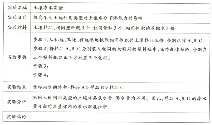 (1)本實驗的目的是探究不同土地利用類型對土壤水分下滲能力的影響,應先明確實驗基本原理,然后對應原理梳理實驗過程,最后將其拆分成4步。
