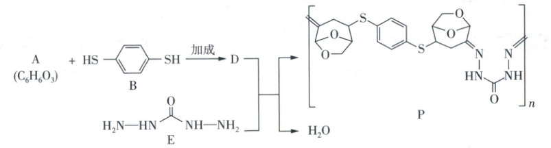 由上述分析,并結(jié)合反應物 A 的分子式及 A 與 B 發(fā)生加成反應,可推出反應物 A 的結(jié)構(gòu)簡式為(*表示手性碳原子的位置),其中有 1 個手性碳原子,A 正確。由高分子 P 的結(jié)構(gòu)簡式可知,反應物 A 與 B 的化學計量比是 2:1,B 錯誤。反應物 D 與 E 反應生成高分子 P 和水,有小分子生成,為縮聚反應,C 錯誤。由高分子 P 的結(jié)構(gòu)簡式可知,高分子 P 中的酰胺基會水解,導致高分子 P 可降解,即高分子 P 可降解的原因是 C—N 鍵斷裂,D 錯誤。