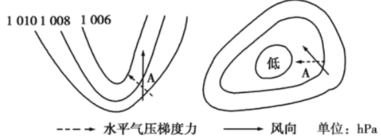 【2】近地面風向受水平氣壓梯度力、地轉偏向力及摩擦力的作用,風向與等壓線斜交;丁地水平氣壓梯度力應由高壓指向低壓且在垂直于等壓線風向,應指向西方,來自東方;由于地處北半球,在地磚偏向力的作用下向右偏,最終指向西北方,來自東南方,形成東南風,因此正確答案為B。