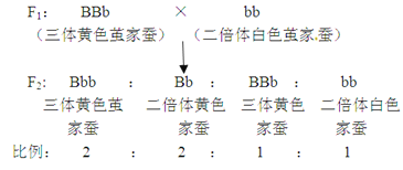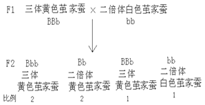(4)白色繭(bb)家蠶為父本,三體黃色繭家蠶為母本(純合體)BBB進(jìn)行雜交,由于BBB產(chǎn)生配子種類是BB、B,F1有兩種BBb、Bb,F1的三體黃色繭BBb與二倍體白色繭(bb)家蠶雜交,BBb個(gè)體產(chǎn)生配子是2B、2Bb、b、BB,F2基因型是2Bb、2Bbb、bb、BBb,其中Bbb、BBb為黃色繭三體,遺傳圖解是: