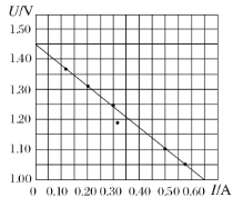 (2)U軸上的截距等于被測量電池的電動勢,由于坐標軸上的數據準確到小數點后兩位,所以我們讀出的數據以此作標準。從圖線上找出兩個點,第一個點是 (0,1.45),第二個點是 (0.50,1.10),由此得出電動勢:E=1.45 V,內阻為:r=